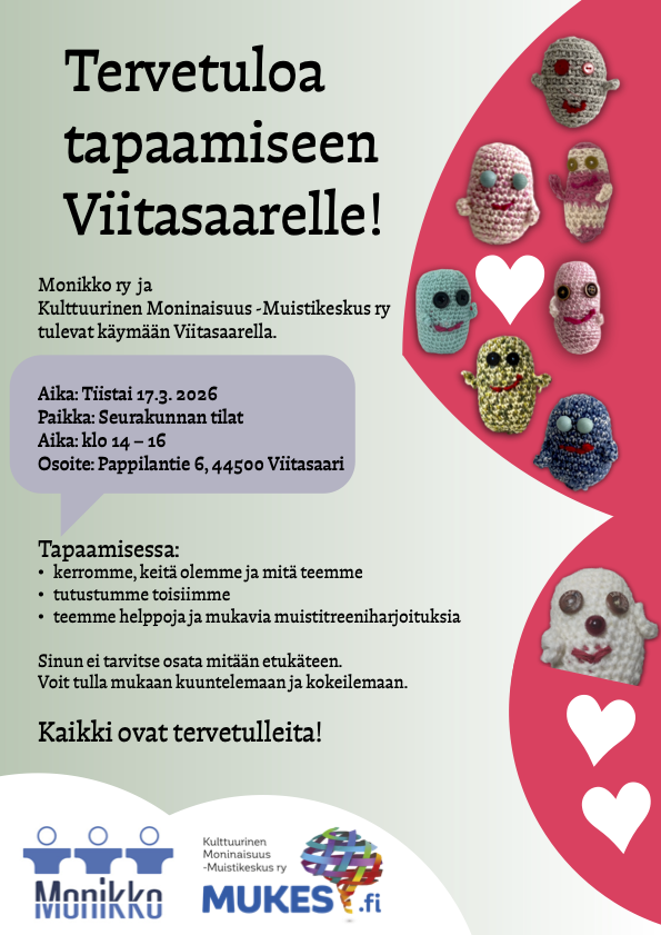 Aika: maanantai 17.3 klo 14 – 16 Paikka: Seurakunnan tilat Osoite: Pappilantie 6, 44500 Viitasaari