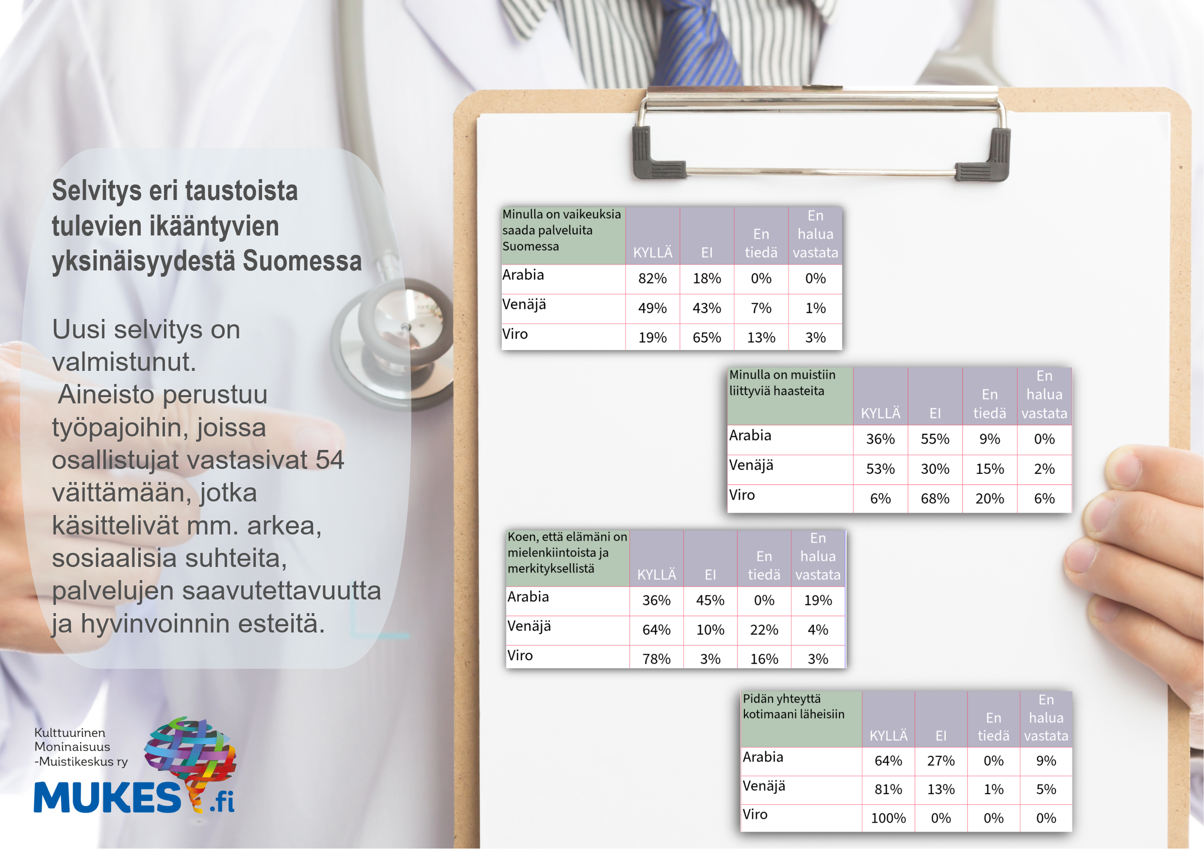 The thesis was carried out as part of the Finnish Centre for Cultural Diversity and Memory, the Jututtaja project. This thesis examined loneliness and social isolation among foreign-language older adults, and during the process, developed a tool for
