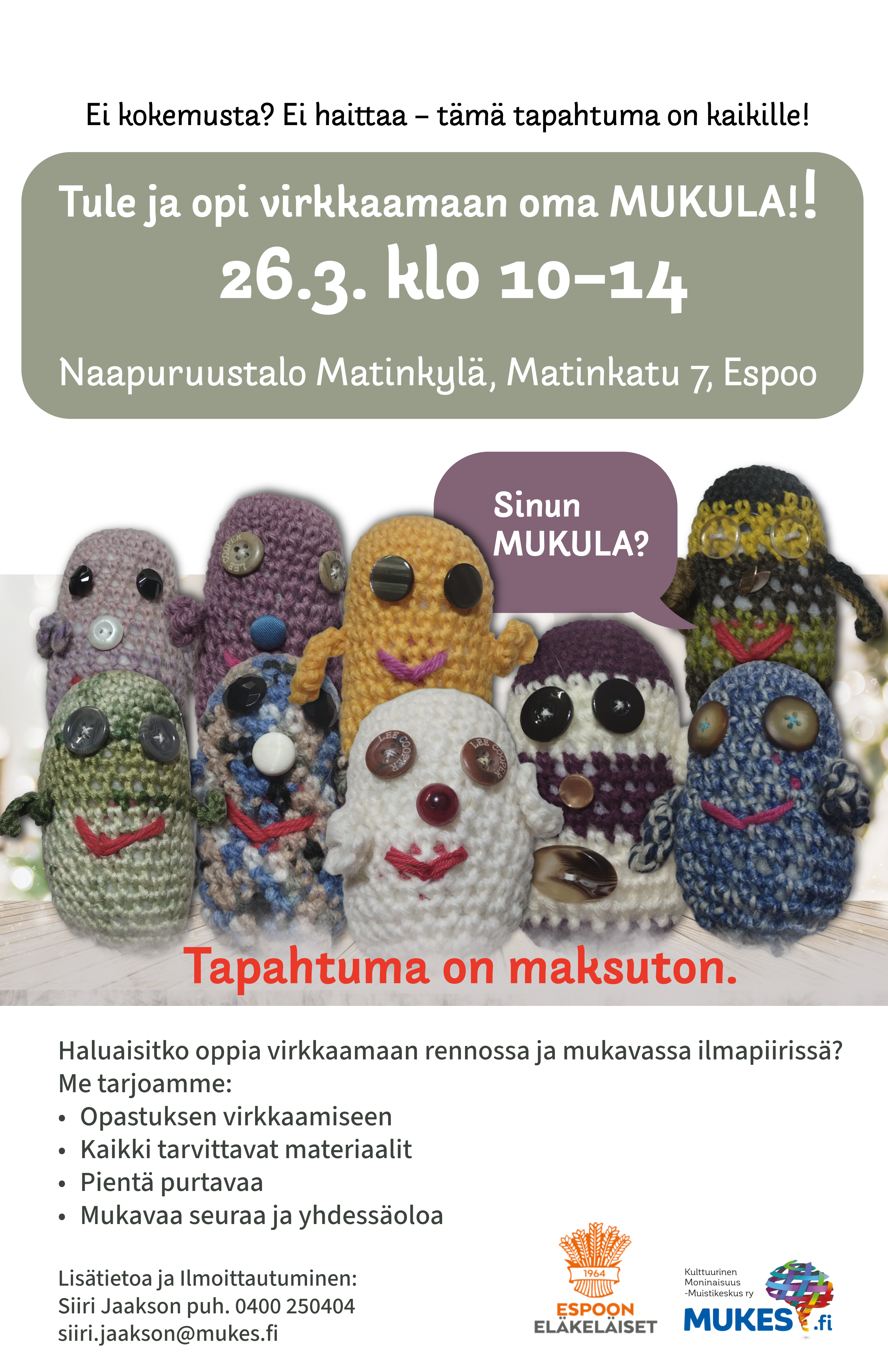 Tämä on ensimmäinen ja todennäköisesti ainoa kerta, kun järjestämme koulutuksen Mukuloiden virkkaamiseen.