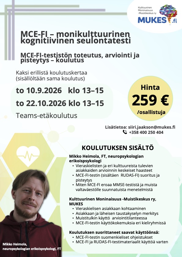 MCE-FI -koulutuksessa perehdytään monikulttuuriseen kognitiiviseen arviointiin kehitettyyn testistöön. Koulutus tarjoaa käytännönläheisen johdatuksen testin käyttöön sosiaali- ja terveydenhuollon ammattilaisten (esim. lääkärit, muistihoitajat, kotihoidon sairaan- ja terveydenhoitajat ym. hoitotyön ammattilaiset) työssä.
